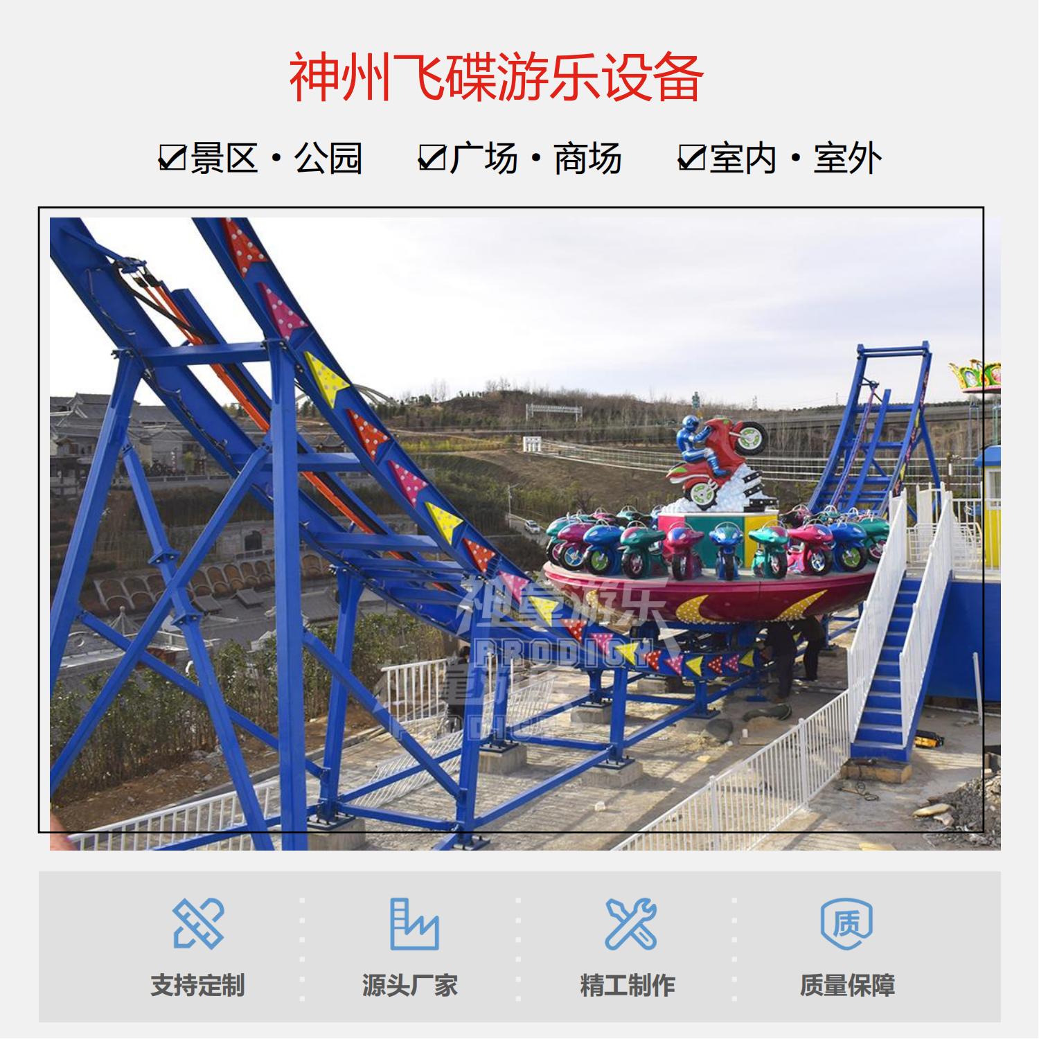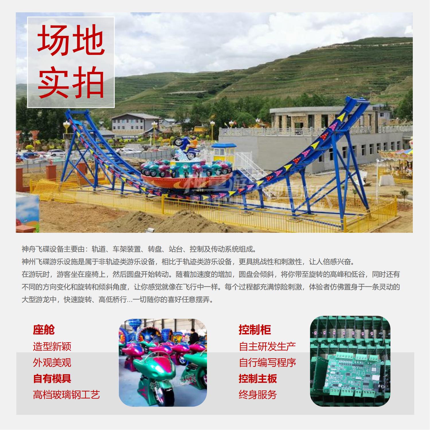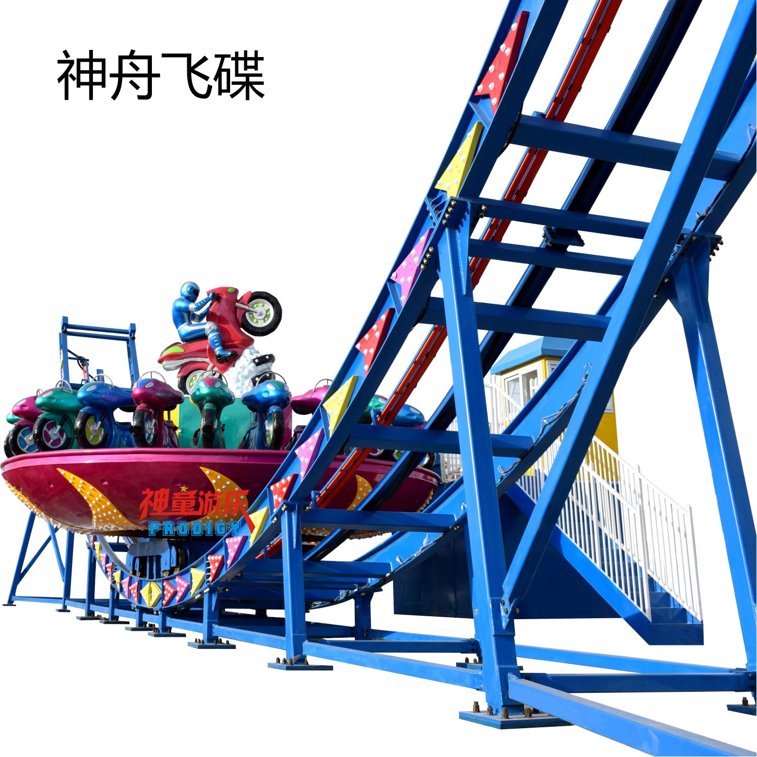 神舟飛碟設備主要由:軌道、車架裝置、轉盤、站臺、控制及傳動系統組成.神州飛碟游樂設施是屬于非軌跡類游樂設備,相比于軌跡類游樂設備,更具挑戰性和刺激性,讓人倍感興奮。在游玩時,游客坐在座椅上,然后圓盤開始轉動。隨著加速度的增加,圓盤會傾斜,將你帶至旋轉的高峰和低谷,同時還有不同的方向變化和旋轉和傾斜角度,讓你感覺就像在飛行中一樣。每個過程都充滿驚險刺激,體驗者仿佛置身于一條靈動的大型游龍中,快速旋轉、高低橋行..一切隨你的喜好任意擺弄。