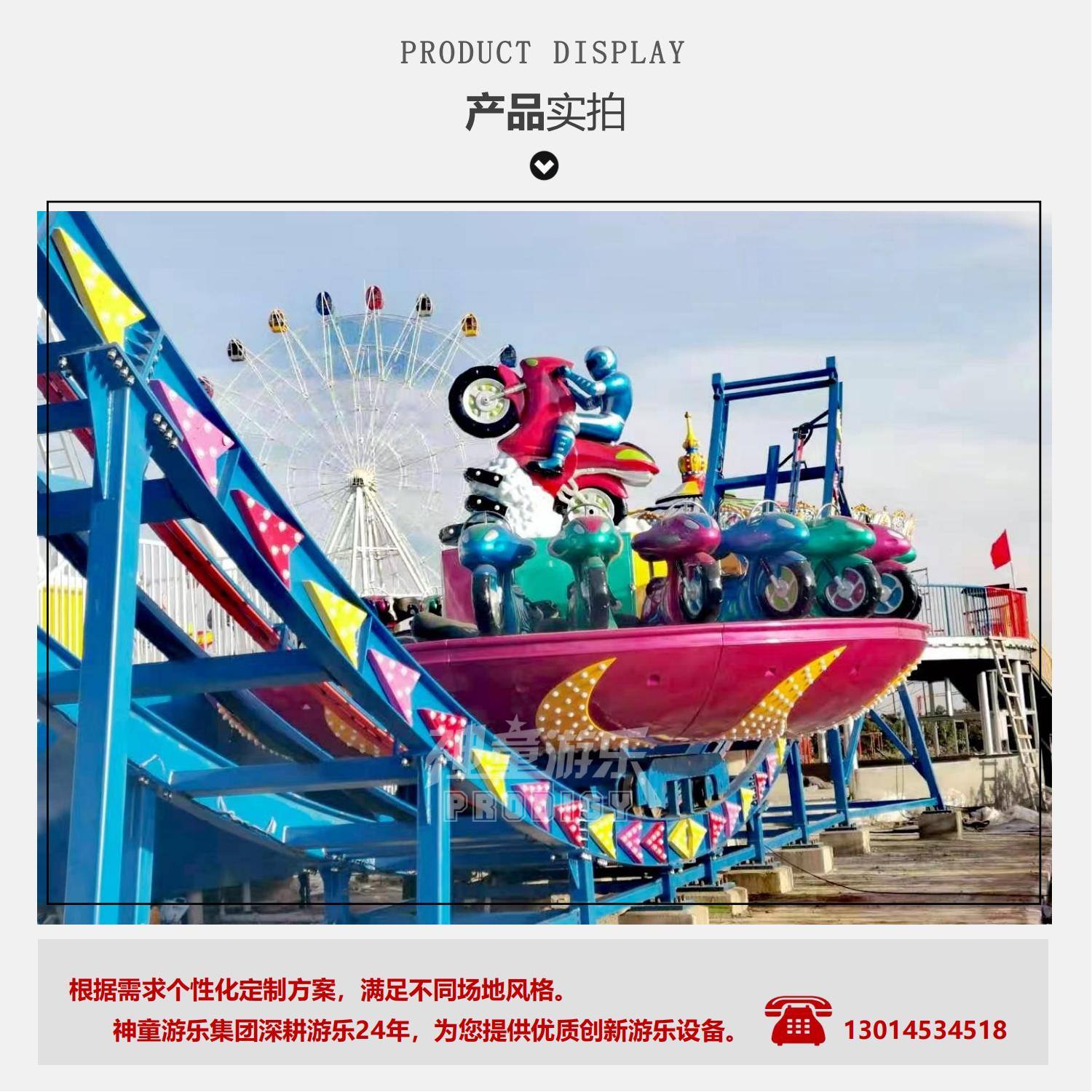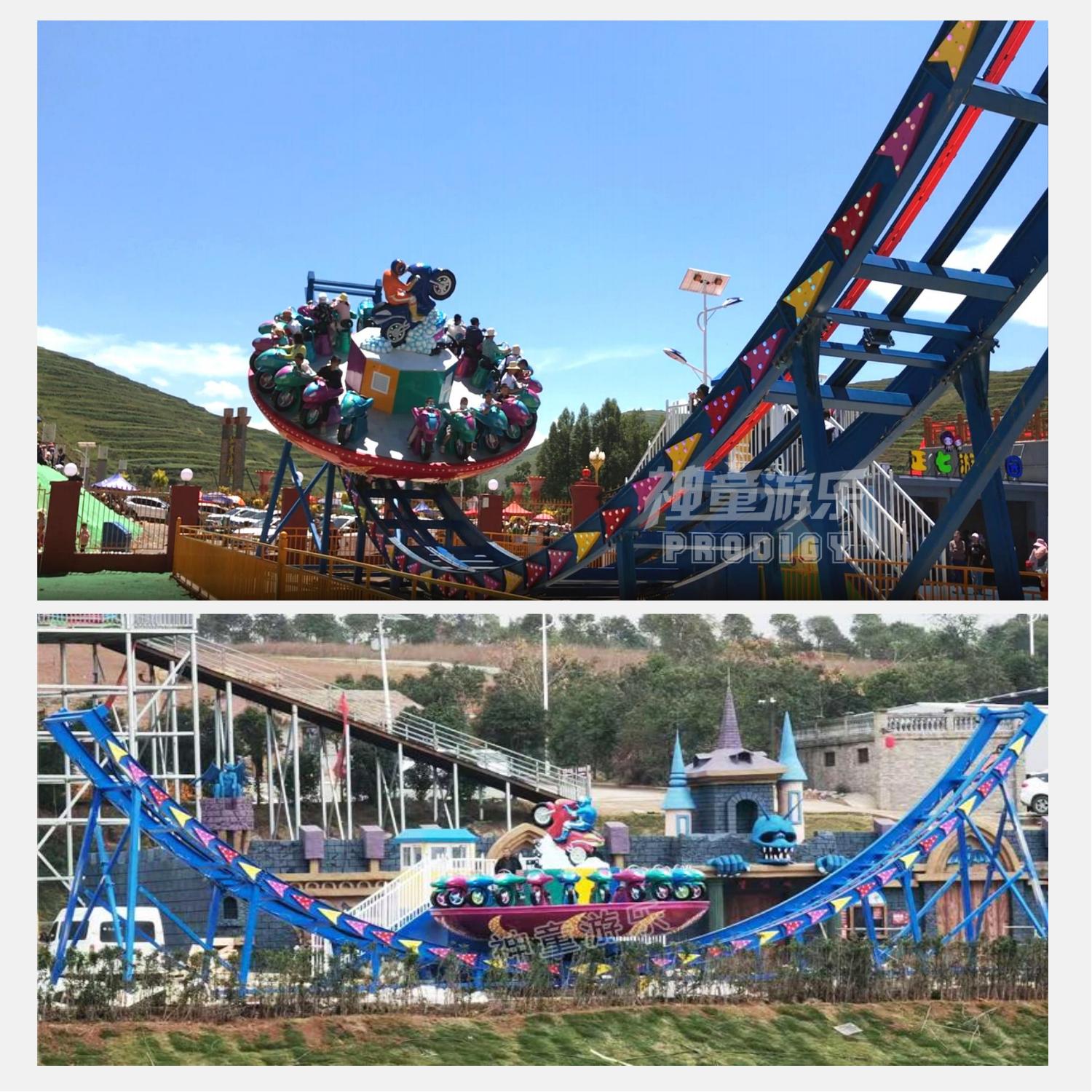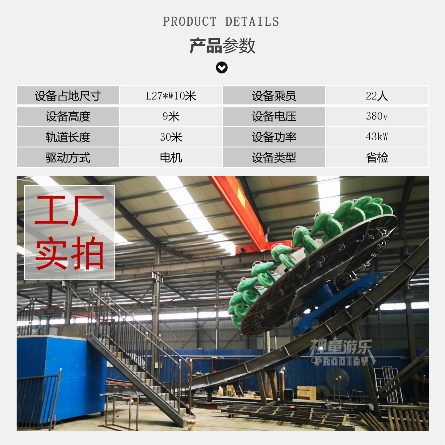 神舟飛碟設備主要由:軌道、車架裝置、轉盤、站臺、控制及傳動系統組成.神州飛碟游樂設施是屬于非軌跡類游樂設備,相比于軌跡類游樂設備,更具挑戰性和刺激性,讓人倍感興奮。在游玩時,游客坐在座椅上,然后圓盤開始轉動。隨著加速度的增加,圓盤會傾斜,將你帶至旋轉的高峰和低谷,同時還有不同的方向變化和旋轉和傾斜角度,讓你感覺就像在飛行中一樣。每個過程都充滿驚險刺激,體驗者仿佛置身于一條靈動的大型游龍中,快速旋轉、高低橋行..一切隨你的喜好任意擺弄。
