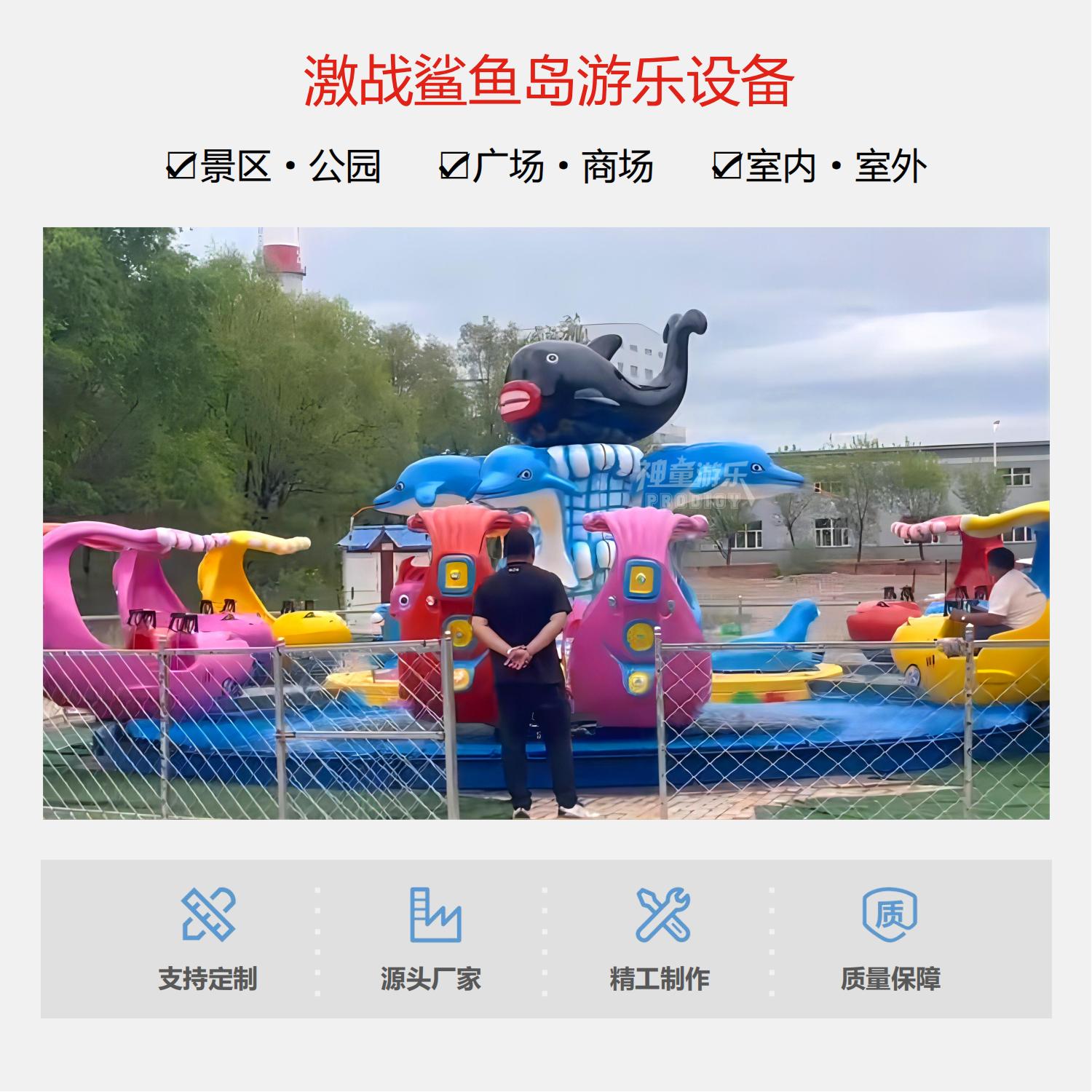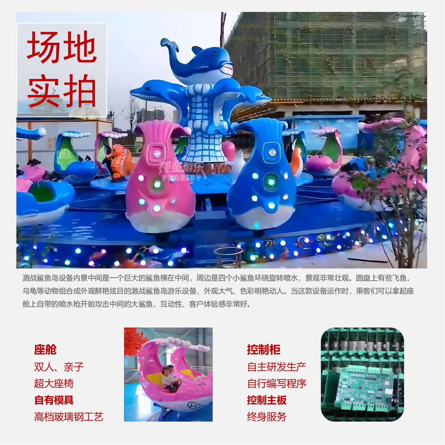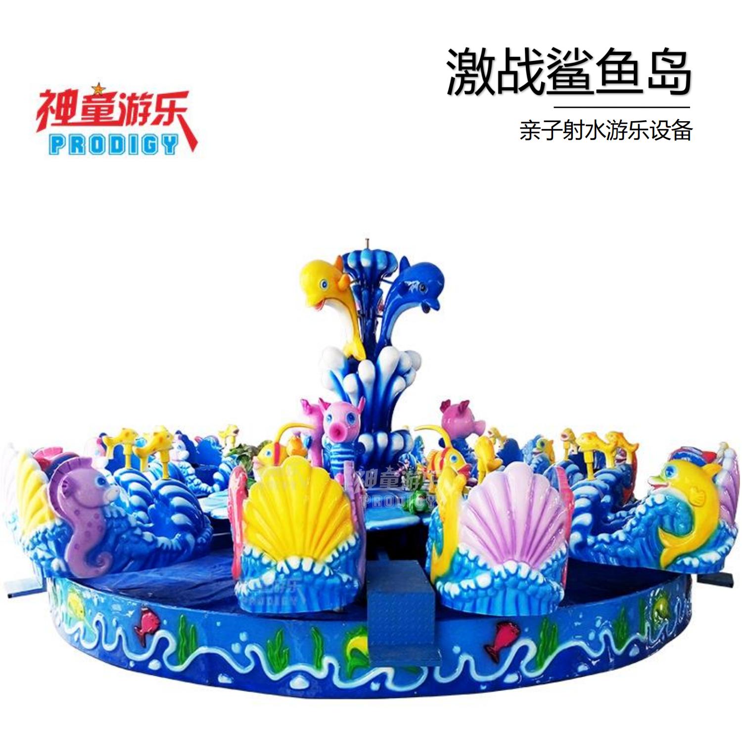 激戰(zhàn)鯊魚島設(shè)備內(nèi)景中間是一個(gè)巨大的鯊魚橫在中間,周邊是四個(gè)小鯊魚環(huán)繞旋轉(zhuǎn)噴水,景觀非常壯觀。圓盤上有些飛魚,烏龜?shù)葎?dòng)物組合成外觀鮮艷炫目的激戰(zhàn)鯊魚島游樂設(shè)備,外觀大氣、色彩明艷動(dòng)人。當(dāng)這款設(shè)備運(yùn)作時(shí),乘客們可以拿起座艙上自帶的噴水槍開始攻擊中間的大鯊魚,互動(dòng)性、客戶體驗(yàn)感非常好。